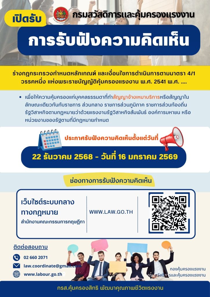ประกาศรับฟังความคิดเห็นร่างกฎกระทรวงกำหนดหลักเกณฑ์ และเงื่อนไขการดำเนินการตามมาตรา 4/1 วรรคหนึ่ง แห่งพระราชบัญญัติคุ้มครองแรงงาน พ.ศ. 2541
